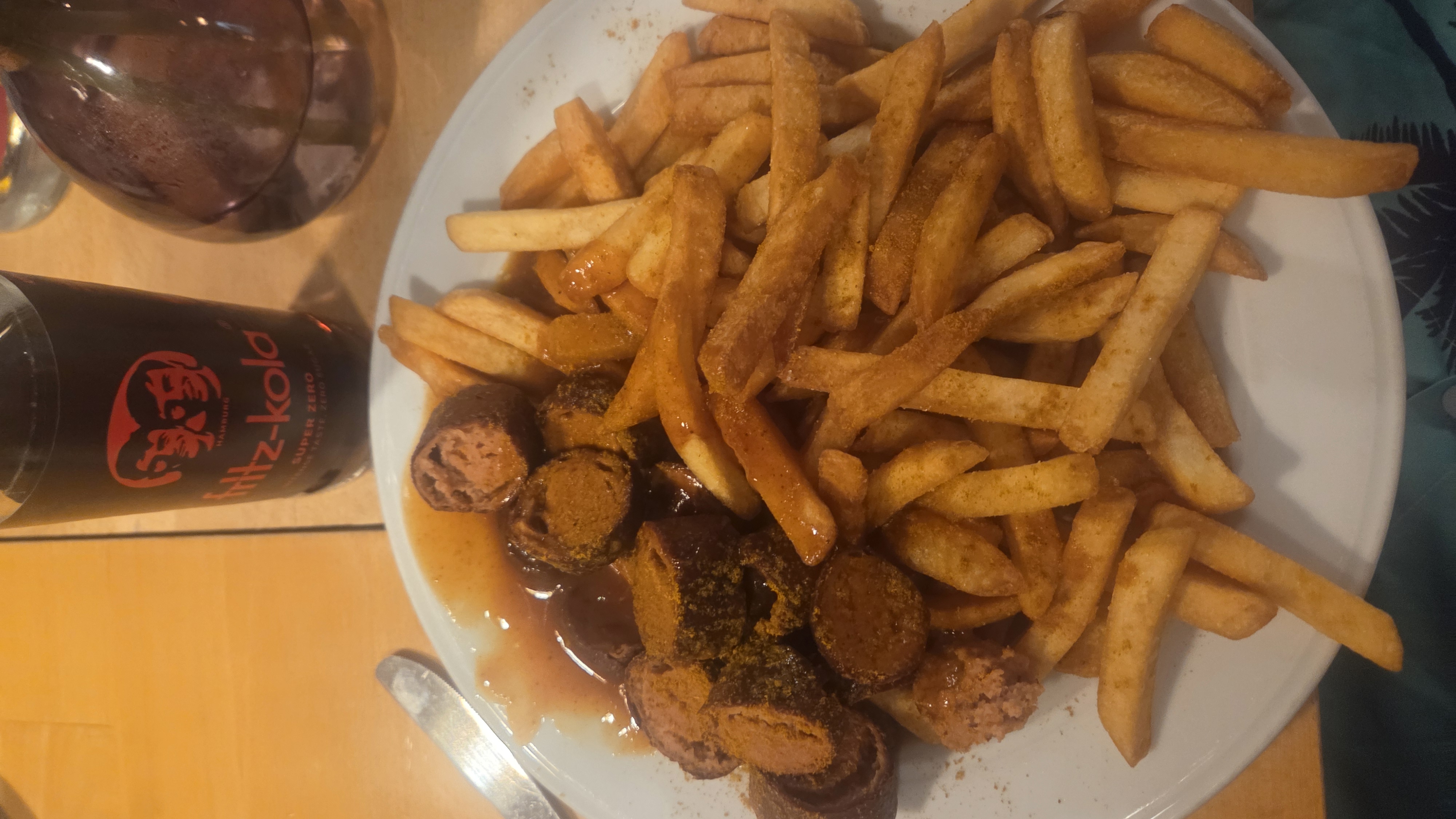 "vegane Currywurst mit Pommes 8,50€ Sojamilch-Ayran 2,50€ Fritz Cola Zero 3€. Ja war ok, aber würde ich nicht nochmal kaufen, Currywurst war eher "mid" Konsistenz fand ich etwas langweilig, und die Pommes waren bisschen zu lange im Ofen."